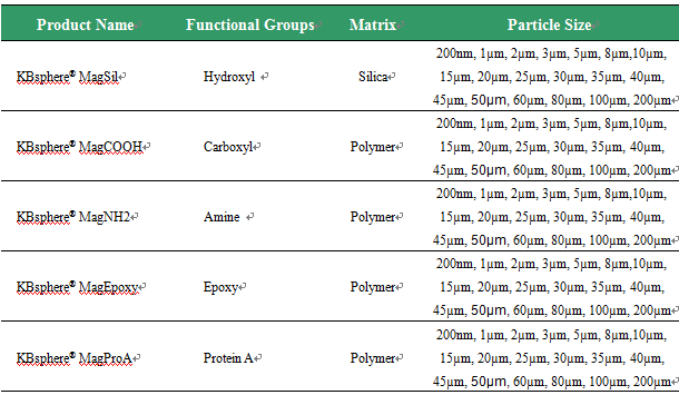 Knowledge & Benefit Tech’s monodisperse magnetic beads with carboxyl groups can be attached with ligands by specific reagents such as EDC, which are designed to apply for protein purification, cell sorting and affinity chromatography.