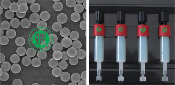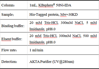 Knowledge & Benefit Tech’s affinity chromatography media were prepared by monodisperse, highly crosslinked polyacrylate microspheres. The affinity chromatography media are produced by first forming a hydrophilic layer on the microspheres. Then, nickel ion (Ni2+) functional groups are chelated onto the hydrophilic layer. Knowledge & Benefit Tech’s affinity chromatography media have high selectivity in separation of histidine labeled proteins.