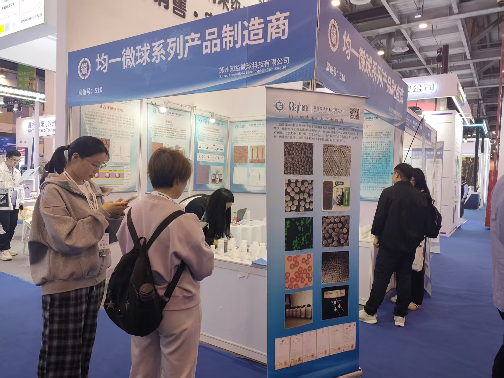 展会期间,知益科技展台迎来了众多来自半导体制造、显示技术、电子材料等领域的专家与企业代表。公司技术团队与来访嘉宾就微球在芯片光刻、显示模组、电路板材料等环节的实际应用案例进行了深入探讨,并分享了知益在微球表面功能化修饰、粒径精准控制及批次稳定性提升方面的最新突破。